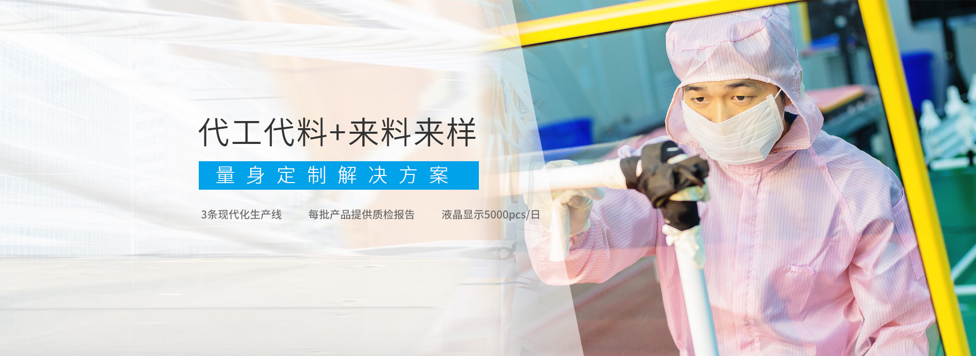 3條現代化全自動生產線,日產5000塊液晶面板。根據客戶需求,提供針對性代工解決方案,成功為眾多實力品牌提供個性化產品代工服務